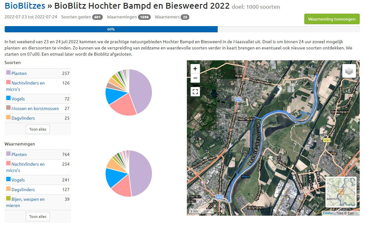 In het weekend van 23 en 24 juli 2022 vond in de natuurgebieden Hochter Bampd-Herbricht en Biesweerd een Bioblitz (of 1000-soortendag) plaats. Doel was om binnen 24 uur zoveel mogelijk soorten te spotten in een bepaald gebied. Zo’n 25 enthousiaste waarnemers namen met veel goesting hieraan deel.Zowel natuurliefhebbers van verschillende leeftijden en achtergronden als experten… Lees verder BioBlitz Hochter Bampd en Biesweerd 2022